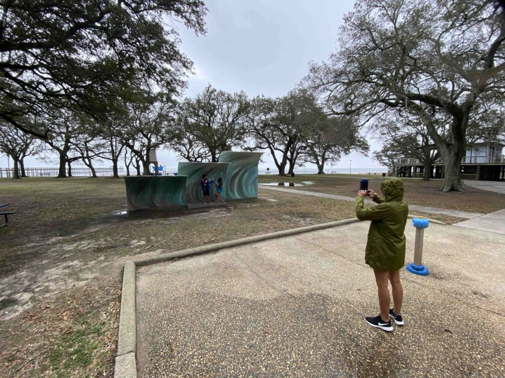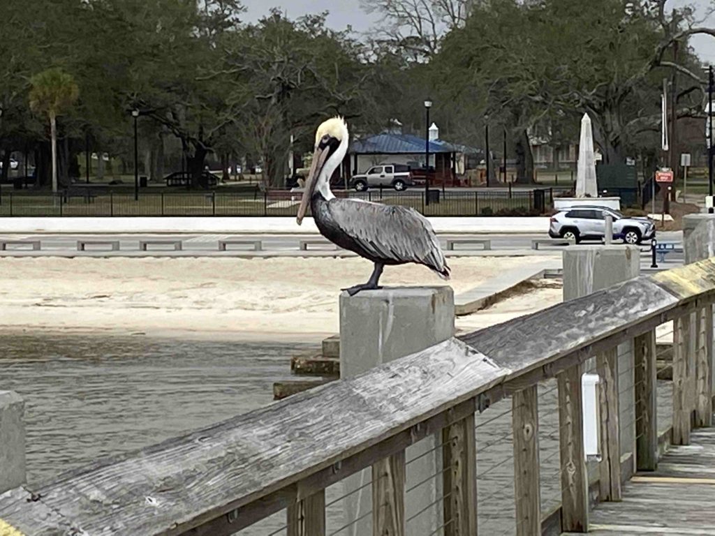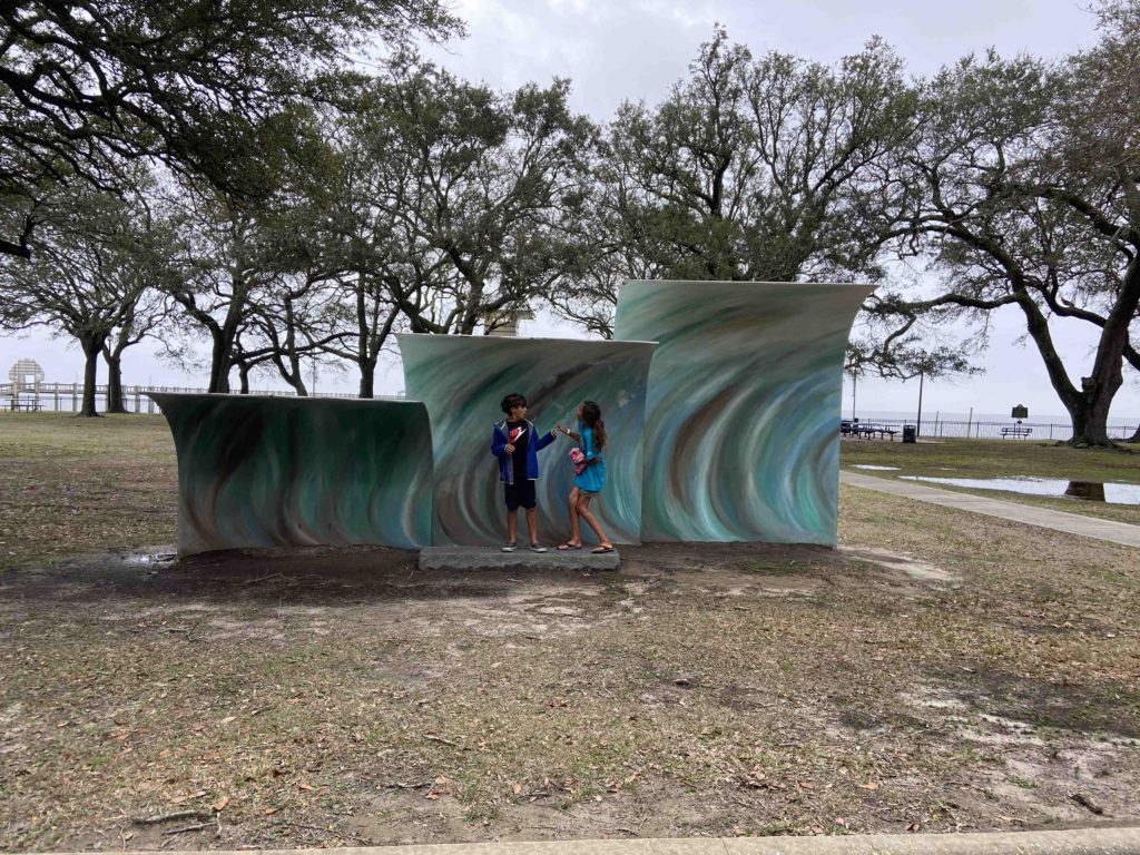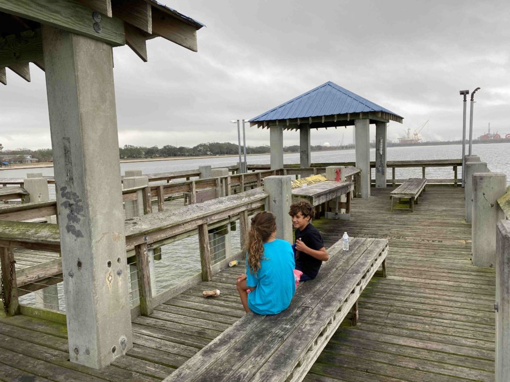 We have a map tracking the progress of our adventure (2 actually – 1 inside and 1 on our door). Lots of campers have these and everyone has different rules for adding a state. For us, our rule is simple. We must do something in the state – visit some site or do an activity – and our camper wheels must role through. We were staying in Alabama as a layover before Louisiana. We had no plans to stay in Mississippi, but we were going to drive through so we decided to make a quick trip during one of our afternoons in Alabama. I did a quick search, and the closest town with anything of significance was Pascagoula. The google search engine told me there was a water side walk with a Hurricane Katrina Memorial. We packed up the kids and discussed what happened during Katrina on our 45 minute drive. As we drove, we passed several ramshackle homes and run down businesses and the sky turned more and more gray. Ben and I questioned our decision. Once we found the memorial site, we also found a huge playground. I love my children because this was a highlight for them, they are always able to find a silver lining. We played for a while and then walked down to the memorial which explains the height of the waves and sustained water levels. It’s difficult to explain the significance to the kids, but we tried. The wind picked up, but there was a really long pier that called to us so we walked it. The pier had great views of the industry on either shoreline, hmmm. Highlight – we got very close to a Pelican! It started to drizzle so we beelined for the car and headed out. One last stop – Ben needed gas and we needed a few groceries so of course we stopped at Walmart, ugh. Did you know that in a Mississippi Walmart wearing a mask correctly means wearing it under your chin? Now you know. Consensus – um, you do not need to visit Pascagoula.