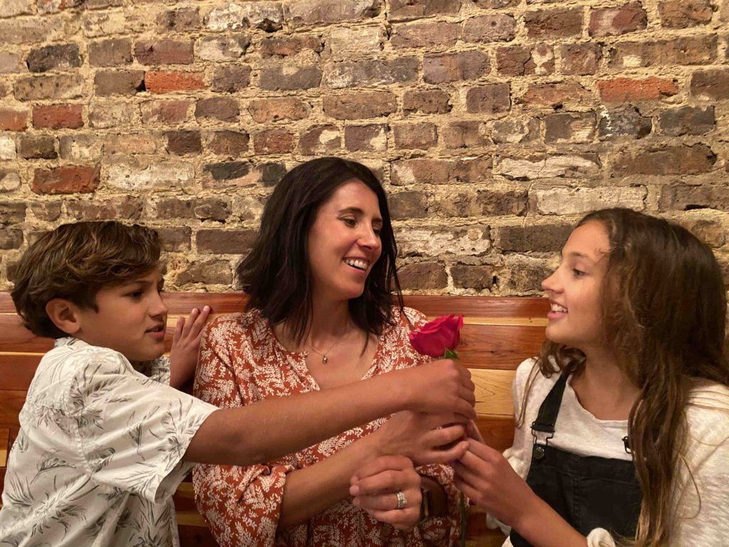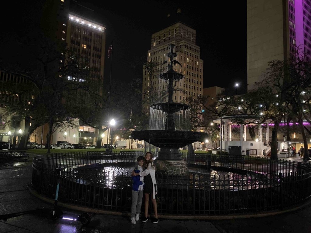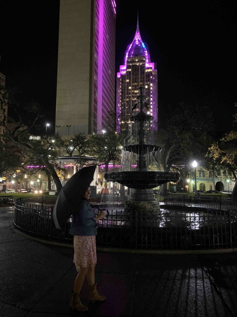 Back to Alabama, and to celebrate our anniversary in a better way, we dressed up and went out to dinner in downtown Mobile. We’ve never gone to dinner with our children on our anniversary before – but sitters are not an option right now, so they came along. Ben always finds good restaurants and he did it again. Due to the rain, we would have to eat inside – it had been nearly a year since we had eaten inside a restaurant. We had reservations for 5 pm, we were the first table. It was empty and we felt fine. Dinner was amazing and having the kids with us was lots of fun. They were sweet, silly, told lots of jokes, had great manners, were a little loud, spilled drinks, got in an argument, ordered expensive dishes (but ate all their food) – we all had a good time. The rain slowed so we walked to a fountain and watched the lights change on the buildings for Mardi Gras.